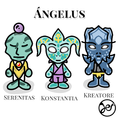 Por tal de preservar el órden en su nueva realidad, consciente de que un mal día podría arruinar su creación decidió crear el Ángelus, una formación de tres entidades parecidas a los ángeles o los dioses, con identidad propia y fiel, de los aspectos que él consideraba importantes. A saber: